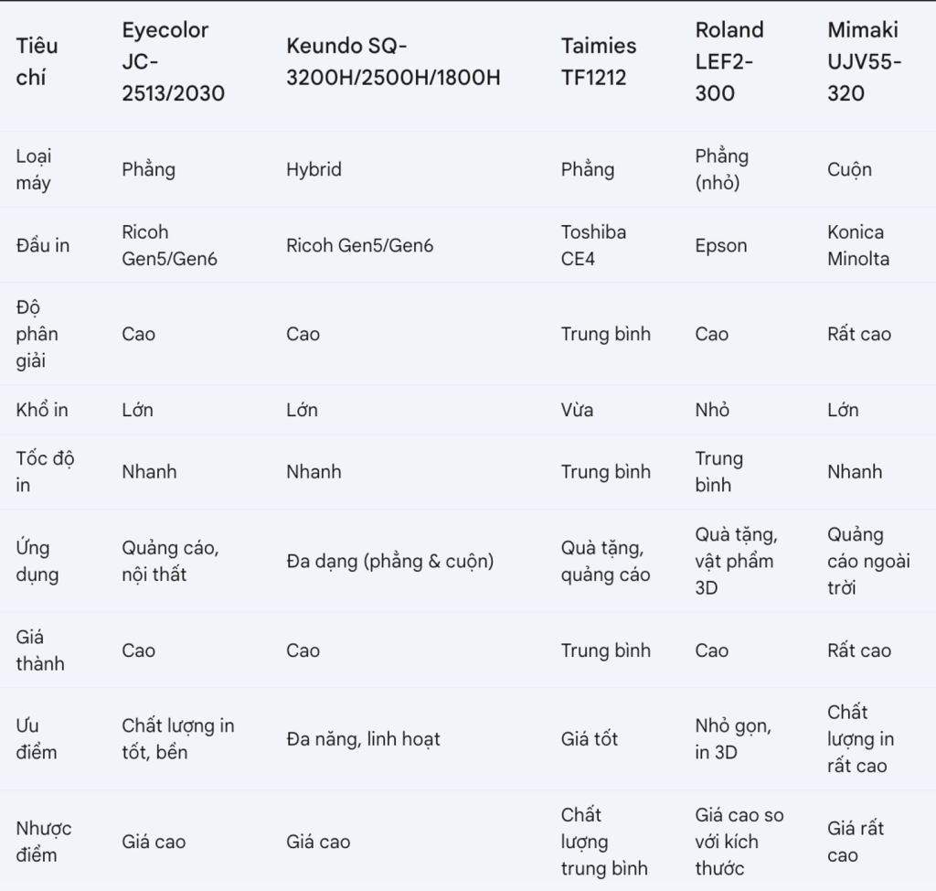 Bảng so sánh một số dòng máy in UV phổ biến: