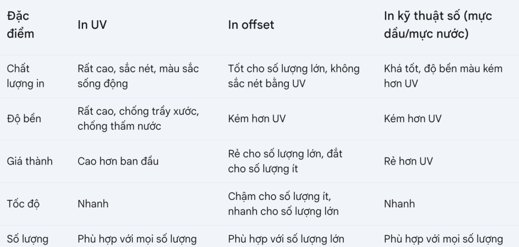 So sánh in UV với các công nghệ in decal khác: