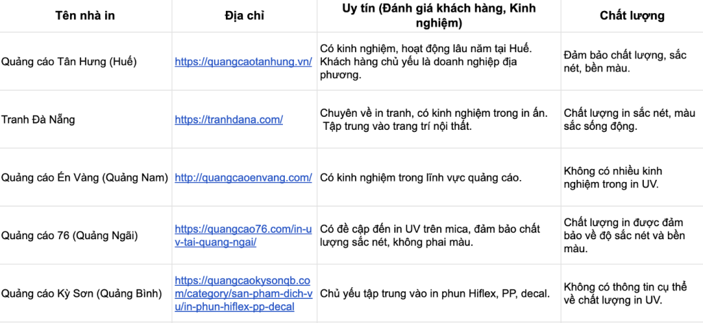 III. Danh sách các nhà in UV tại miền Trung