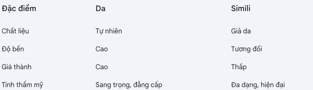 Simili là một chất liệu giả da, có nhiều màu sắc, độ bền và giá thành hợp lý. Simili thường được sử dụng để thay thế da thật trong nhiều ứng dụng.