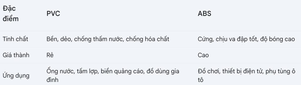 - Tính chất: Nhựa PVC và ABS đều là nhựa nhiệt dẻo, có độ bền cao, khả năng chống va đập tốt và dễ dàng gia công.